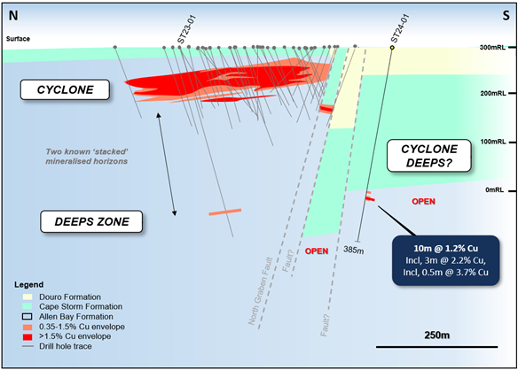 High-grade copper mineralization has been discovered at depth, offset to the south of the Cyclone Deposit (Figure 4). The Cyclone Deeps intersection of 10m @ 1.2% Cu (drill hole ST24-01) displays a typical sediment hosted copper mineralogical profile with a high-grade core of native copper and chalcocite (including 3m @ 2.2% Cu) with peripheral chalcopyrite and other less copper-rich sulfide minerals.