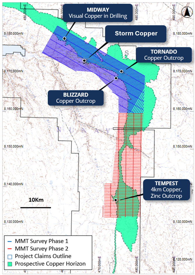 The initial MobileMT survey will be completed over the Midway-Storm-Tornado area as an orientation survey to determine the response of the known deposits before extending the survey into more regional areas. The survey will begin in the coming week, allowing results to inform drill targeting and prioritization this season.