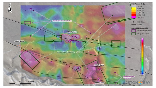 The 2021 EM surveys, commissioned by Aston Bay’s partner American West Metals Limited (“American West”), targeted extensions along strike and at depth of known mineralization, and followed up on previous geophysical anomalies. The surveys were completed in August 2021 to enhance existing targets and identify new potential drill targets ahead of the proposed 2022 drilling campaign. Previous EM surveys have successfully identified several strong conductive anomalies that are associated with known copper mineralization in the Storm Project area, including a large conductive anomaly associated with the high-grade 4100N Zone (intercepts include 67.6 m @ 1.33% Cu from 43.4 m in hole ST99-47).