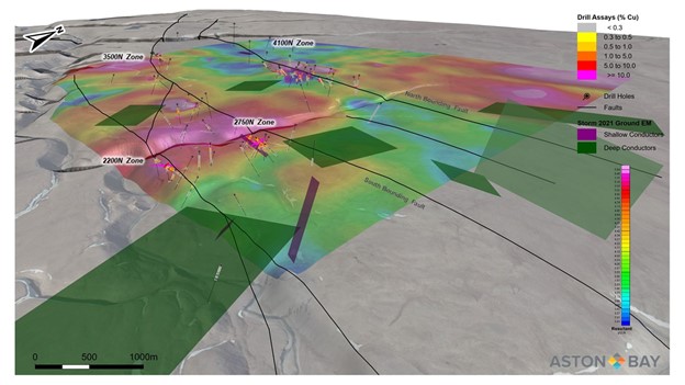 Thomas Ullrich, CEO of Aston Bay commented, “The initial results of the 2021 geophysical surveys demonstrate the efficacy of ground EM as an exploration tool at Storm, and further reinforce our belief that undiscovered, blind zones of high-grade copper mineralization exist in underexplored areas of the Project. Utilizing modern instrumentation capable of resolving anomalies with improved resolution and at greater depth than previous surveys has enabled our partners at American West to identify multiple new conductors warranting follow up work, including several drill-ready targets. We look forward to continuing our work with American West’s technical team to refine targets identified by the 2021 survey, and to plan additional geophysical surveys and new targets ahead of a proposed 2022 drill campaign.”