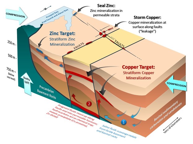 Figure 3: Schematic geological section and targeting model for the Storm and Seal Projects. The project currently contains stratiform zinc and structurally controlled copper mineralization, and it is believed a stratiform source of the Storm copper mineralization may be present at depth.