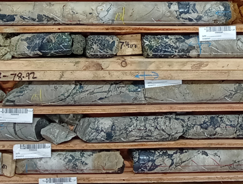 Figure 4: Dense semi-massive and breccia visual chalcocite (dark grey mineral) from PFS-002 (72.7-76.5m downhole). This interval assayed at an average grade of 8.3% Cu, 31g/t Ag.