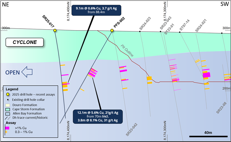 The copper mineralization in PFS-002 is located approximately 70m to the north of the current pit design. Follow-up drilling further to the north-east also intersected mineralization within the same horizon (9.1m @ 0.6% Cu, 3.7g/t Ag in SR25-017 – Figure 5). The mineralized horizon remains open to the north and along the entire northern margin of the deposit, highlighting the growth potential of the existing resource.