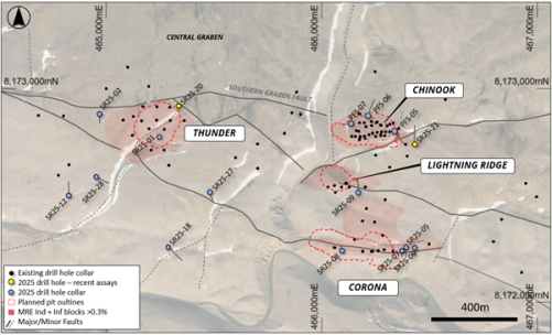 Figure 8: Drill hole locations in the southern areas from the 2025 resource drilling program included in this report, overlaying MRE and pit outlines, existing drilling, and aerial photography.