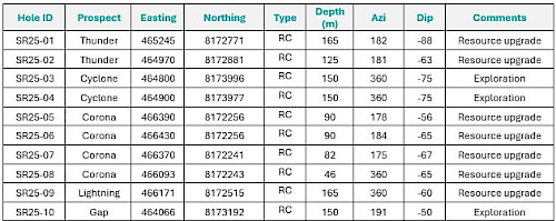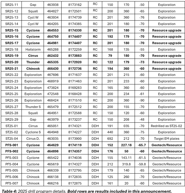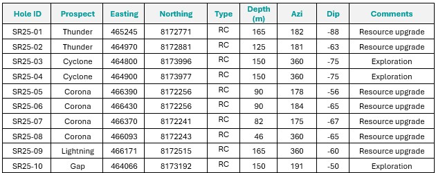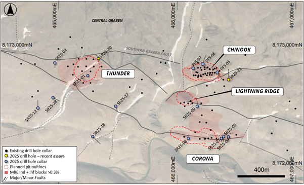 Thick intersections of copper close to the surface have been confirmed in key areas within and outside of the current resource envelopes (drill holes SR25-011, -015, -016, -017, -019, and -020). The drilling was designed to upgrade the existing inferred category resources and to potentially expand the current open-pit designs. Importantly, several of these intervals have higher grades than the current resource estimate (MRE), confirming confidence in the continuity and quality of the current resources.