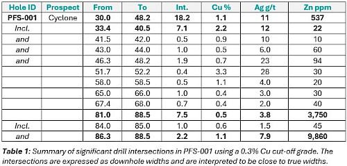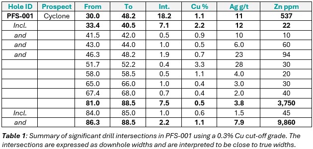 PFS-001 was drilled to a depth of 152m on the southern margin of the Cyclone Deposit (Figures 2, 6 & 7).