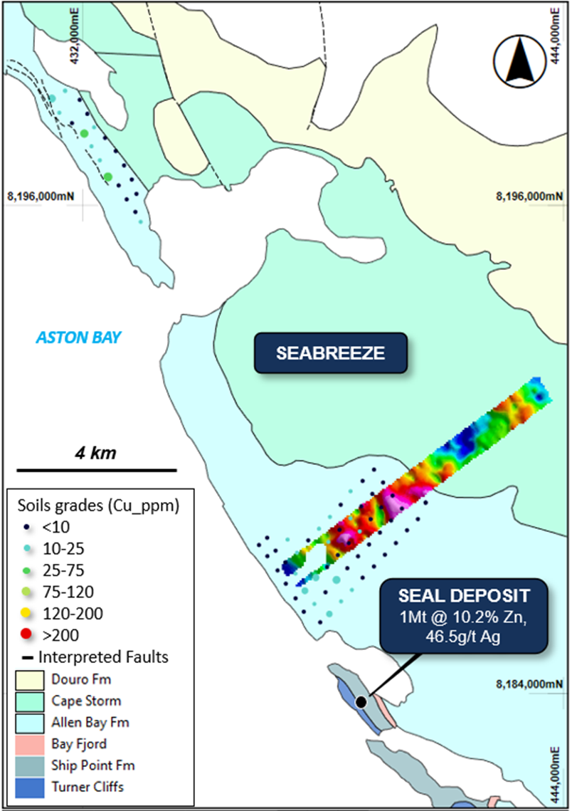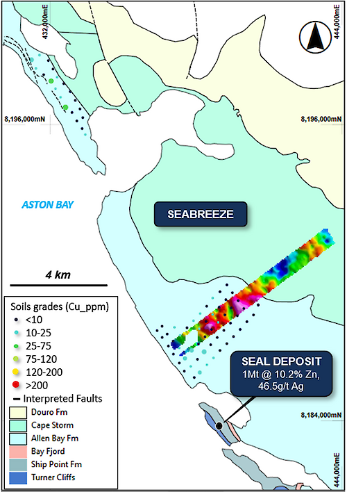Figure 3: Seabreeze prospect showing soil sample locations, copper geochemistry, and the gravity imagery (Bouguer anomaly - hotter colours indicate an increase in density), overlaying regional geology. Note the location of the contact between the Cape Storm and Allen Bay Formations, and proximity to the Seal zinc-silver deposit.