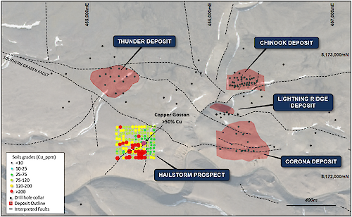 Figure 4: Map of the Southern Graben area showing the location of the Hailstorm Prospect and copper soil geochemistry in relation to the known copper deposits, overlaying aerial photography and major faults.