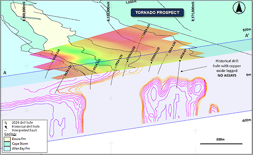 The survey defined two strong anomalies located within the prospective Allen Bay Formation. The 3D modelling suggests that the EM anomalies may be flat lying and located deeper than the current limit of the recent RC drilling (>150 m vertical depth, Figure 5). The strong positive correlation between the recent MLEM surveys, historical VTEM surveys, and copper mineralization supports the interpretation of the structural setting and deep copper potential at Tornado.