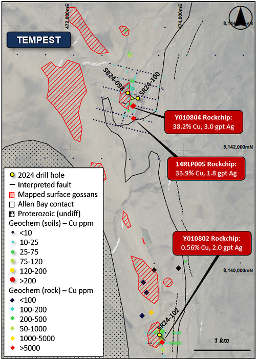 Although the high grades of the surface gossans were not replicated with the current drilling, the 4 km strike length of the gossans and thick intervals of zinc and silver in the drilling suggest a significant mineralizing event. Furthermore, the copper deposits at Storm are typically confined to the upper sequence of the Allen Bay Formation near the contact with the Cape Storm Formation. This contact is mapped further east in the Tempest area, suggesting that the current drill holes have intersected the lower, less prospective part of the Allen Bay Formation.