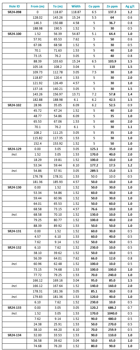 Anomalous copper, zinc or silver were observed in all drill holes. The highest copper and silver values were intersected in drill hole SR24-129, located proximal to the northern Tornado graben fault, a similar position to the copper-mineralized historical drill hole AB18-07 as described earlier (Table 2).