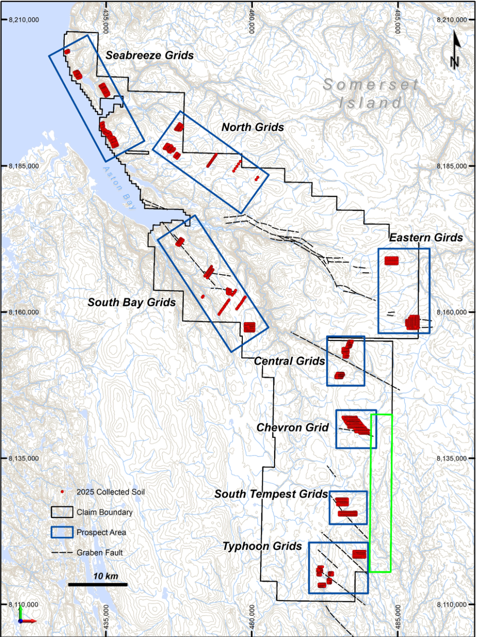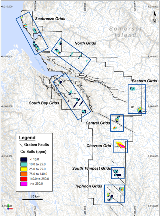 "We are very excited by this discovery of a new Storm-sized copper anomaly at our Project on Somerset Island. At the main Storm area, a similar copper-in-soil anomaly sits above a significant near-surface copper resource, as well as above several other deeper copper discoveries. The newly identified Chevron area shows similar potential. This four-kilometre trend has seen no significant surface sampling to date, and no geophysics or drilling has ever been conducted. The follow-up exploration will add significant discovery potential to next season’s program, in addition to the compelling targets already defined by this year’s helicopter-borne Mobile Magnetotelluric geophysical survey.