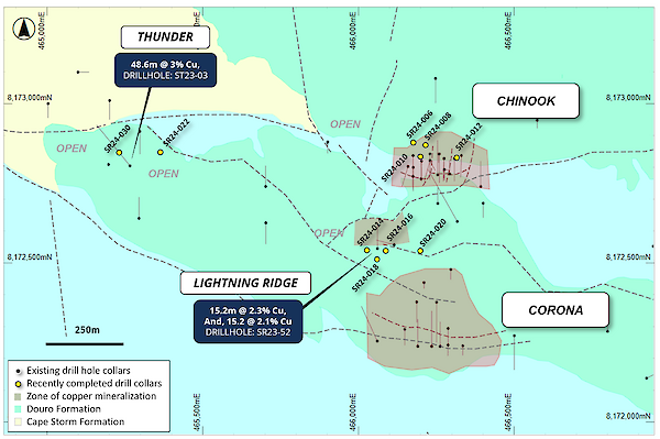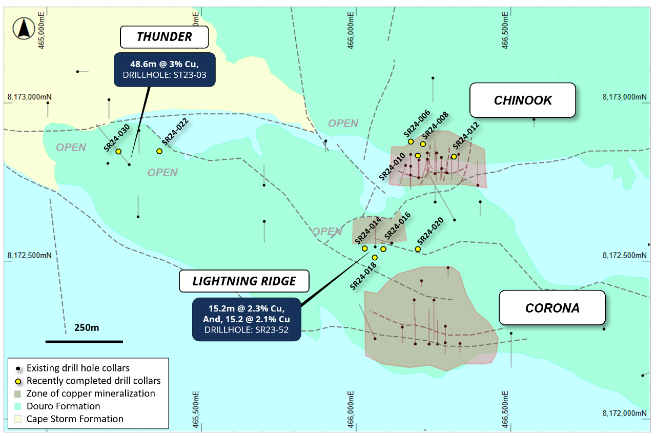 The initial Lightning Ridge drilling has successfully confirmed the continuity and likely geometry of the high-grade mineralization. The steeply dipping copper mineralization (discovery hole SR23-52 intersected 30.4m @ 2.1% Cu, 5.4 grams per tonne (“g/t”) silver (“Ag”) can now be traced over a strike of at least 150m, with further extensions interpreted to be likely, given the thick intervals of the visual mineralization in the outlying drill holes.