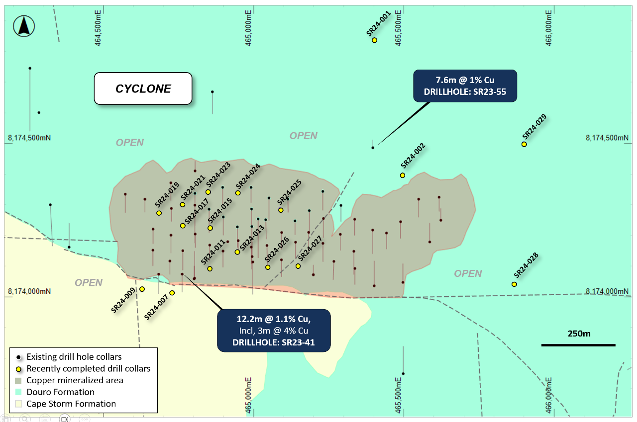 SR24-009 was drilled approximately 80m south-west of the Cyclone Deposit and to a downhole depth of 120.4m. The drill hole was designed to test for potential extensions to the existing known copper mineralization.