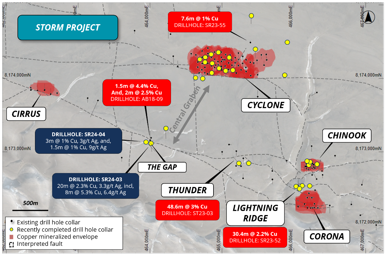 Both the Allen Bay host rock and copper mineralization in SR24-009 are displaced downward relative to the Cyclone Deposit at this location, south of the fault that marks the northern edge of the Central Graben (Figures 2 and 6). This large block of downward-faulted rock within the Central Graben is defined by faults that are spatially associated with the majority of the copper mineralization at Storm and are the likely plumbing system for mineralizing fluids. Confirmation of downward-displaced copper mineralization in this drill hole highlights the potential for the Central Graben to host significant copper mineralization that is not seen at the surface.