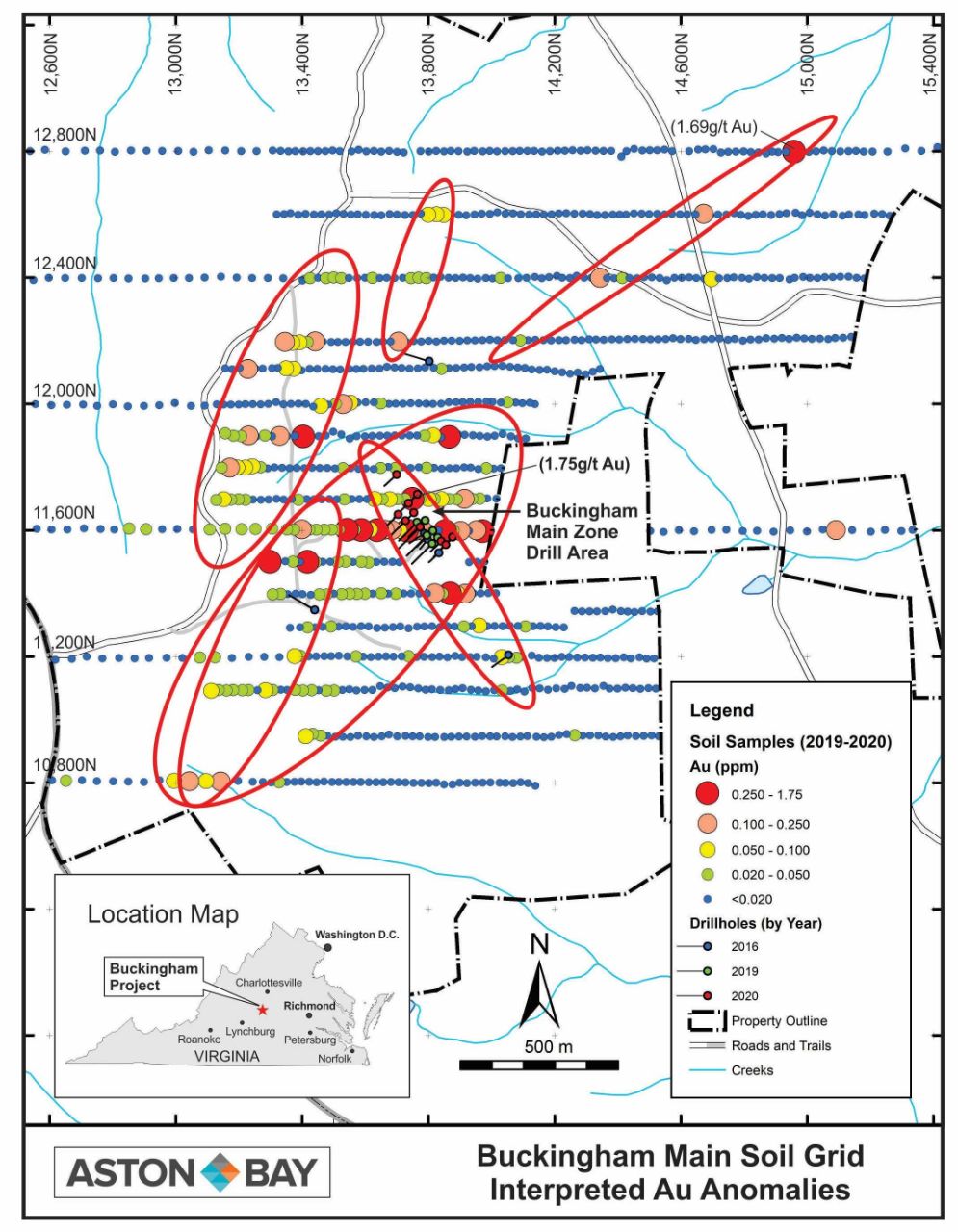 Aston Bay Holdings Ltd. (TSX-V:BAY; OTCQB:ATBHF) (“Aston Bay” or the “Company”) is pleased to present results from the initial soil sampling program conducted at its Buckingham Gold Property located in Central Virginia, USA. The survey identified a broad but discreet 1.0 x 1.8 kilometre (km) gold anomaly spatially associated with the gold-bearing quartz vein and zones of disseminated gold-quartz mineralization drilled in 2019. In addition, the survey identified several detailed gold-in-soil trends at its Buckingham Main Zone and several new gold anomalies elsewhere on the property which remain to be drill tested.