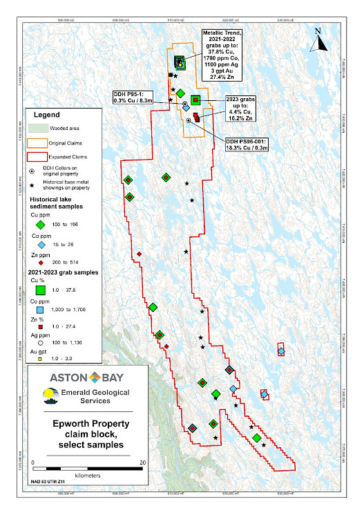 Figure 2: Epworth Property claim block with select rock grab and lake sediment samples. From over 300 rock grab samples, 51 samples yielded over 1% Cu, 29 samples yielded over 30 g/t Ag and 15 samples yielded over 1% Zn. Noted historical diamond drill intersections are from a total of 130 m of drilling in three diamond drill holes on the property.
