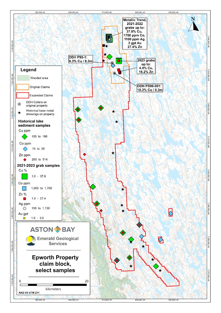 Figure 2: Epworth Property claim block with select rock grab and lake sediment samples. From over 300 rock grab samples, 51 samples yielded over 1% Cu, 29 samples yielded over 30 g/t Ag and 15 samples yielded over 1% Zn. Noted historical diamond drill intersections are from a total of 130 m of drilling in three diamond drill holes on the property.