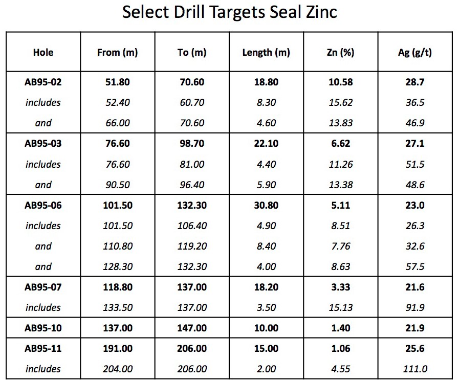 The Seal Zinc deposit is estimated to contain 1.006 million tonnes (“Mt”) at a grade of 10.24% zinc and 46.5 grams per tonne (“g/t”) silver, using a cutoff of 4.0% zinc equivalent. The estimate is based on diamond drilling conducted by Teck in 1995-96 and Noranda in 2001.