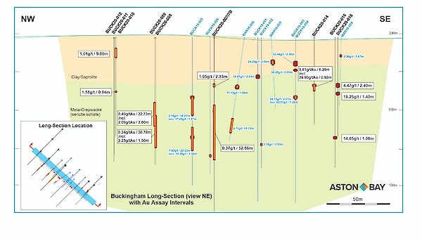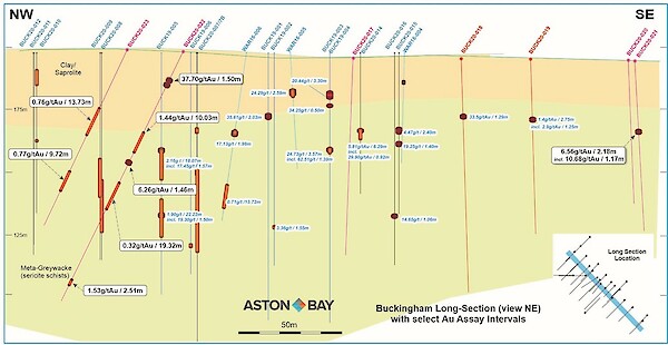 The NW-SE trending Buckingham Main Zone, which comprises a series of visible gold-bearing quartz vein outcrops that extend over a strike length of some 150 m have yielded grab sample assay values up to 701 grams per tonne (g/t) Au. Previous drilling included core-length intercepts of up to 35.6 g/t Au over 2.03 m and 24.7 g/t Au over 3.57 m (2019 drilling) and 5.81 g/t Au over 6.29 m including 29.9 g/t Au over 0.92 m, 19.25 g/t Au over 1.4 m and 14.54 g/t Au over 1.06 m (2020 Phase 1 drilling) in gold-bearing quartz veins, as well as 2.2 g/t Au over 18.1 m and 1.9 g/t Au over 22.2 m in adjacent but separate sericite-quartz-pyrite alteration zones (see June 27, 2019 and July 22, 2020 Aston Bay releases).