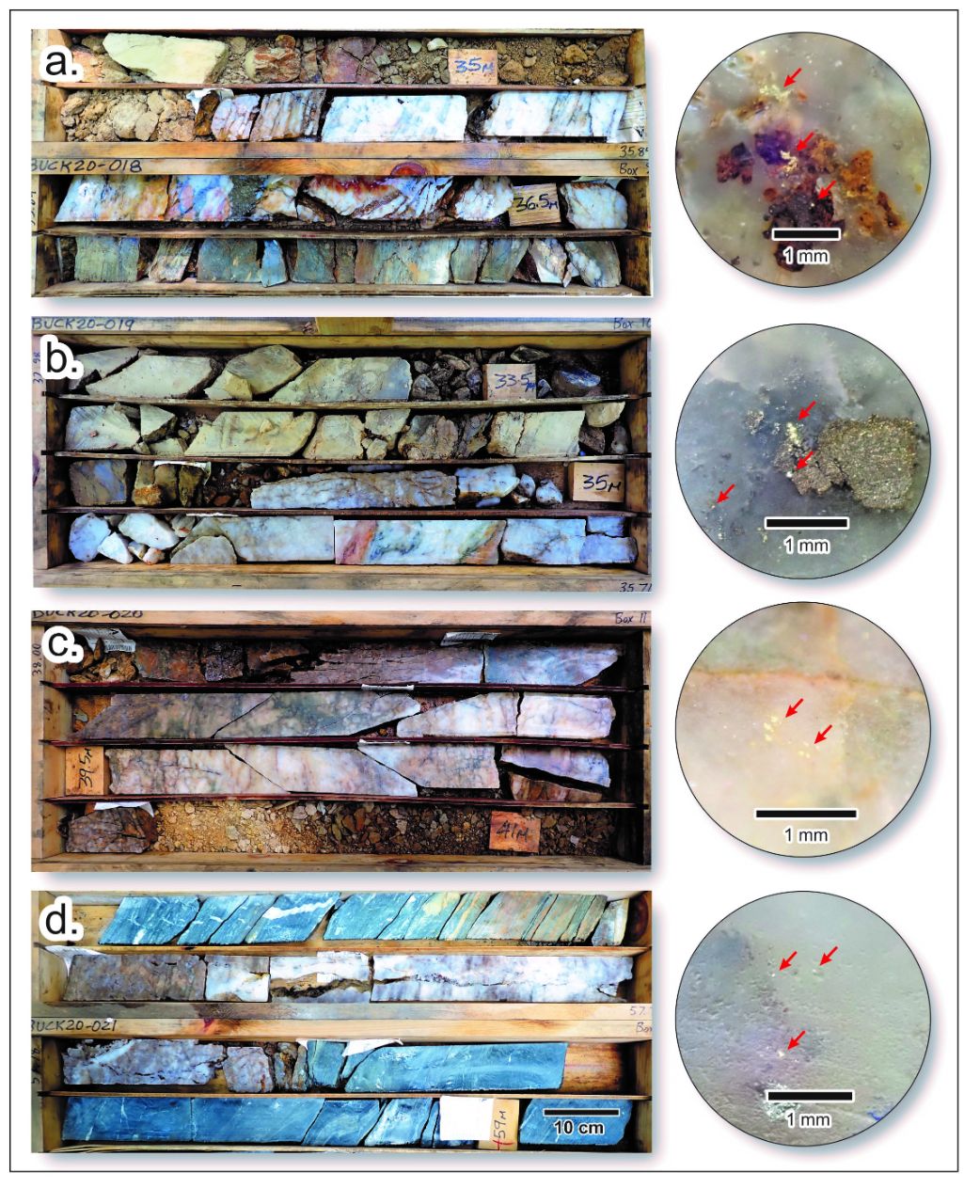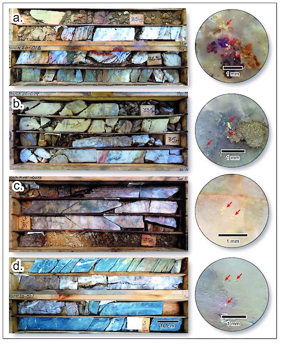 Figure 3: Photographs of quartz vein intervals intersected in HQ-sized diamond drill holes: a) BUCK-018, b) BUCK-019, c) BUCK-020 and d) BUCK-021 with examples of visible gold noted in each intersection depicted at right, indicated by red arrows. Assay results pending. Scale as noted.