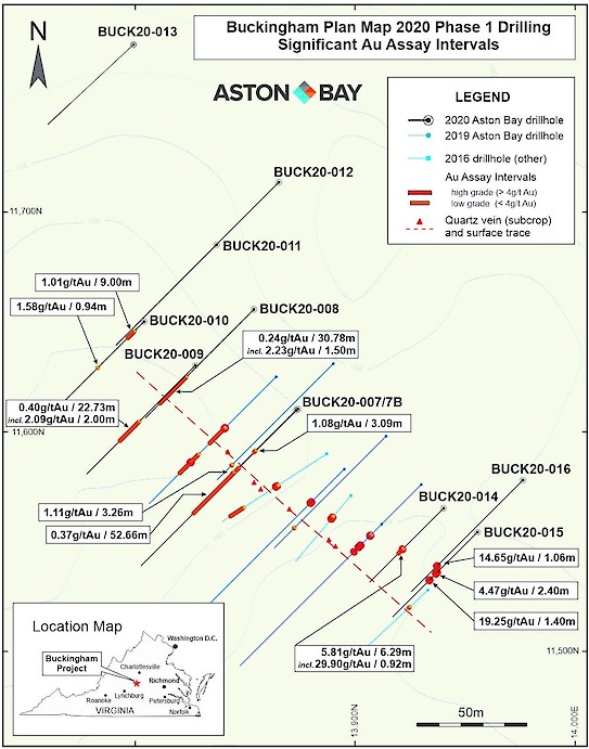 Phase 2 of the diamond drill program at Buckingham Gold Property located in Central Virginia, USA has been completed. Phase 2 of the 2020 Buckingham drill program comprised seven (7) large diameter (HQ) oriented diamond drill holes totaling 803 metres (m), which added to the 1,218 m drilled in ten holes in the first phase of the program in March; results from two of these holes have been previously reported (see August 4 and 10, 2020 Aston Bay press releases).