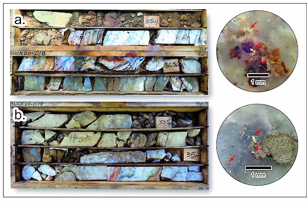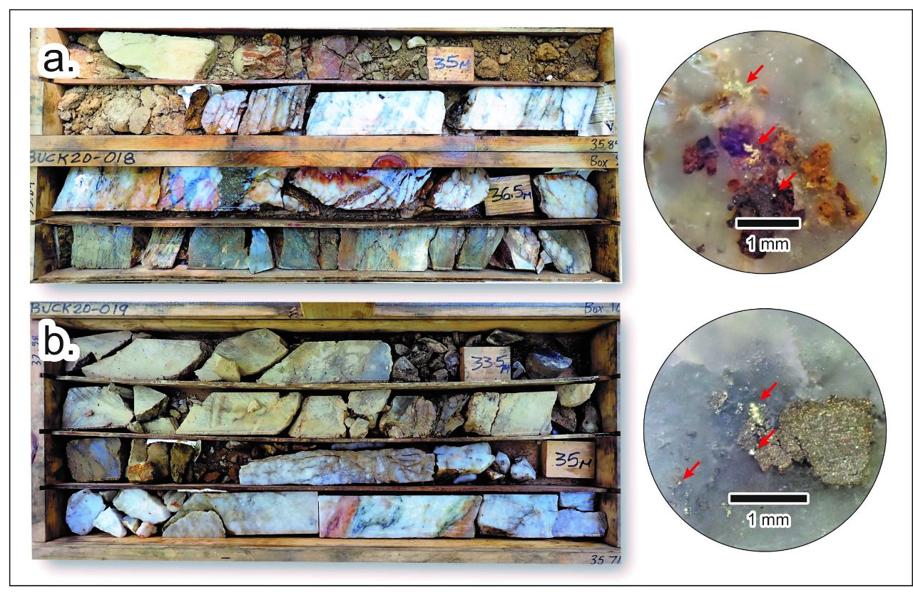 Figure 4: Photograph of quartz vein intervals intersected in HQ-sized diamond drill hole a) BUCK-018 and b) BUCK-19 with examples of visible gold depicted at right, indicated by red arrows. Scale as noted.