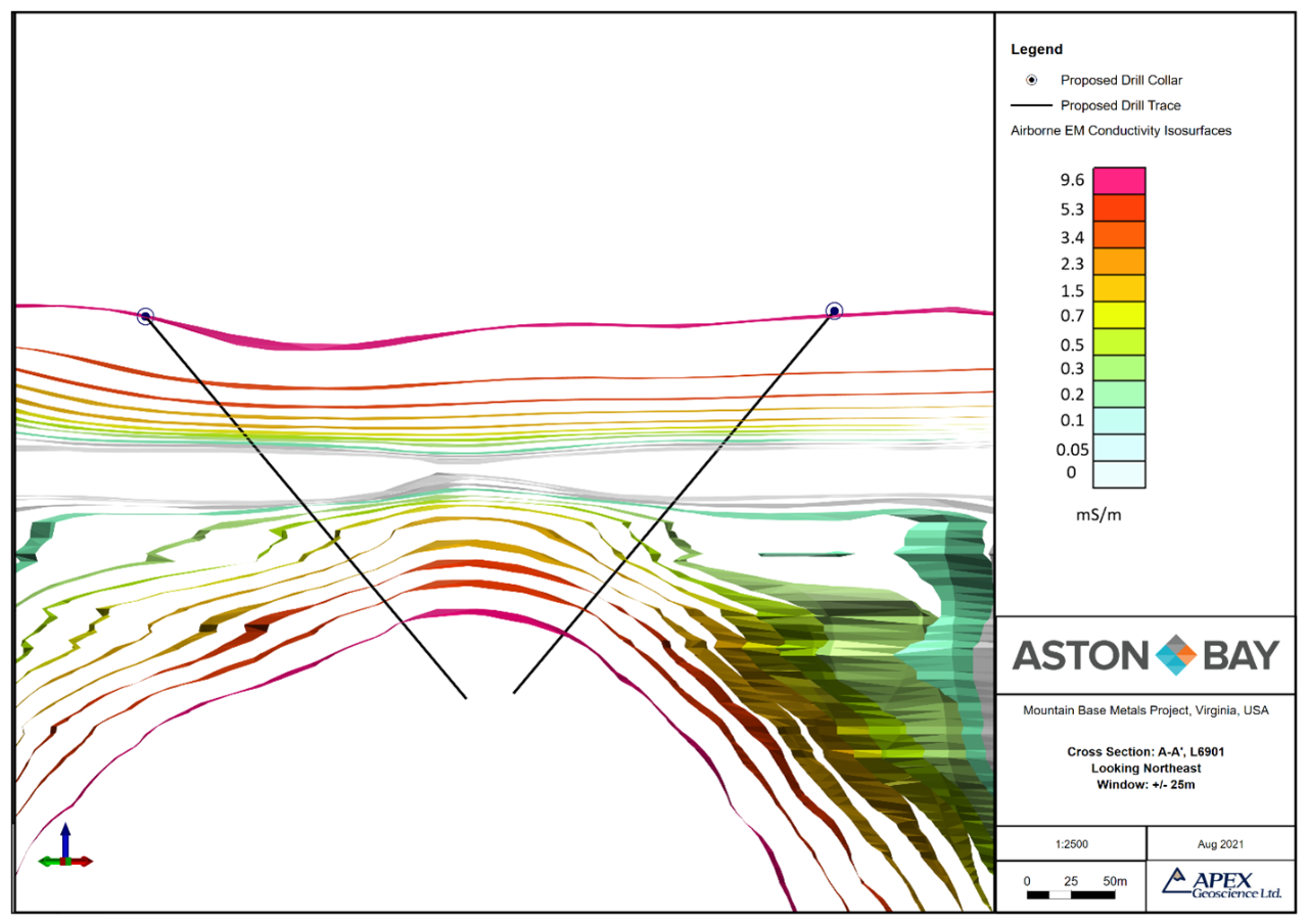 Figure 2. Cross Section A-A’. Proposed drill holes intersecting strongly conductive EM anomaly.