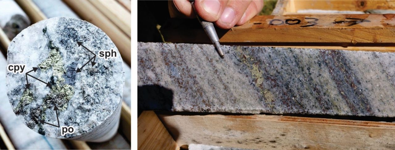 Figure 3: Banded disseminated sulfide mineralization in drill core, Mountain Base Metals Project, Central Virginia (cpy = chalcopyrite, sph = sphalerite, po = pyrrhotite). Drillhole ABM21-003, approximately 265 meters down hole. Core diameter 47 millimeters (1.8 inches).
